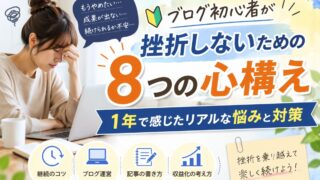 読書_実践編 ブログ初心者が挫折しないための8つの心構え|1年で感じたリアルな悩みと対策 ブログ初心者が挫折する原因と対策を解説。継続できない悩みを解決する8つの心構えや、モチベーションを保つコツを実体験をもとに紹介します。 2026.04.17 読書_実践編