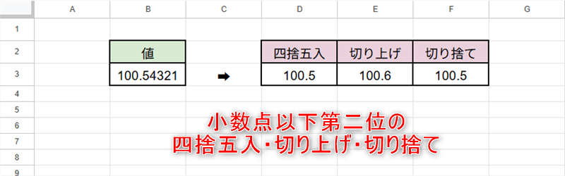小数点以下第2位の四捨五入・切り上げ・切り捨ては次のようになります。