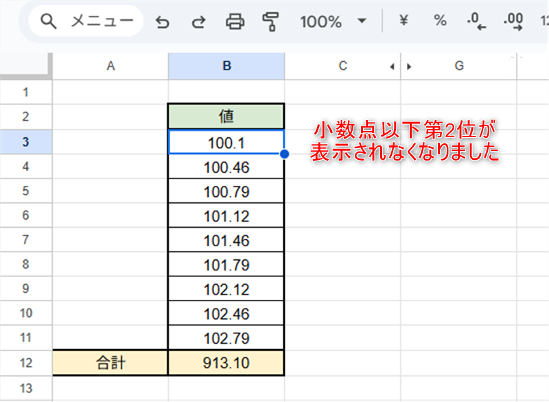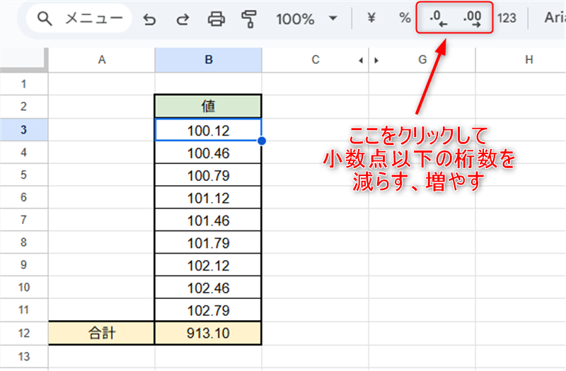 スプレッドシート上部のメニューから「小数点以下の桁数を減らす」をクリックします。