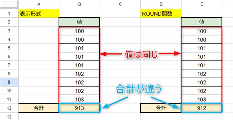端数処理のやり方次第で、数値が大きく変わるのが分かるかと思います。