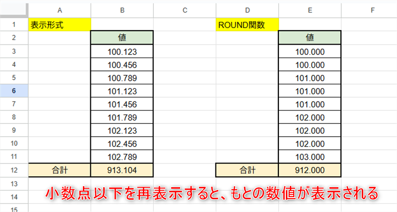 「表示形式」の変更は、端数を処理するわけではなく表示方法を変えただけです。
