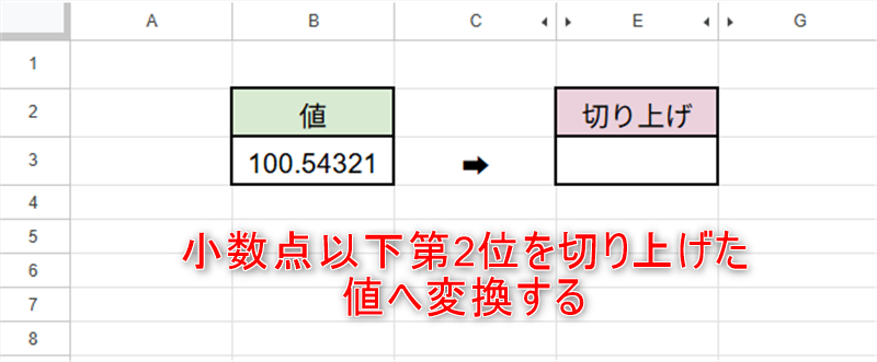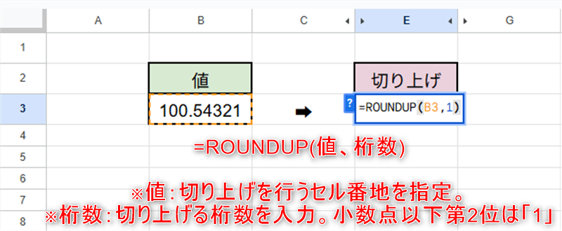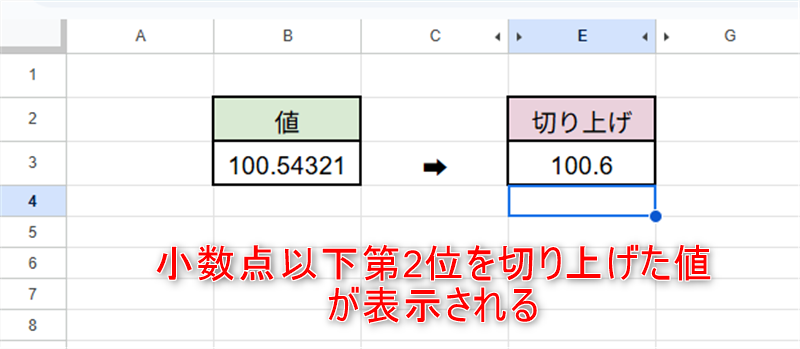 小数点以下第2位を切り上げた値がセル「E3」に表示されました。