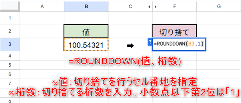 「ROUNDDOWN」関数は、指定した桁数で切り下げる数式です。