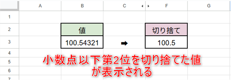 小数点以下第2位を切り捨てた値がセル「F3」に表示されました。