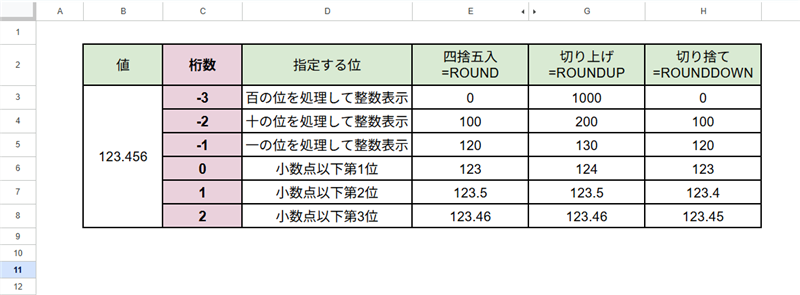 - 切り上げ:指定した位が0より大きければ切り上げて1繰り上がる
